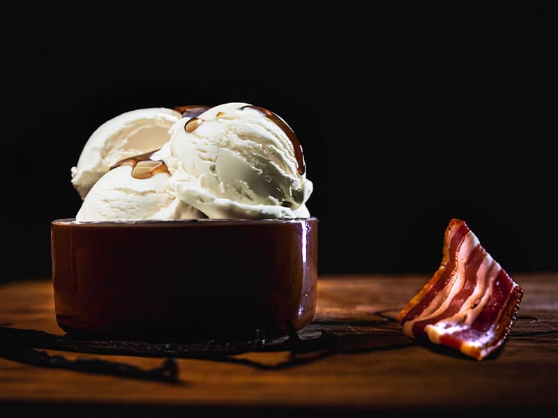 Vanilla ice cream infused with bacon, served with a generous topping of bacon bits tossed