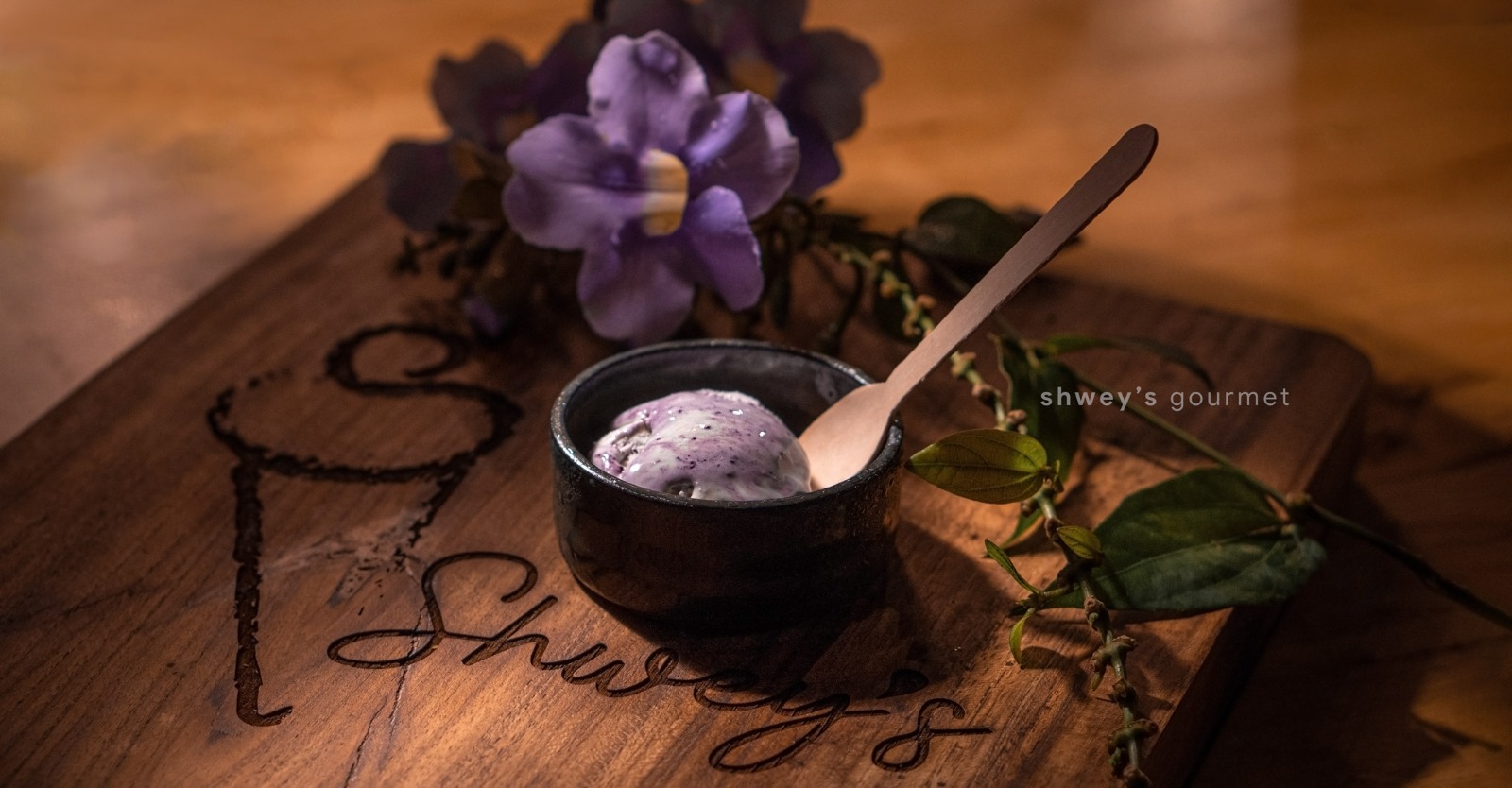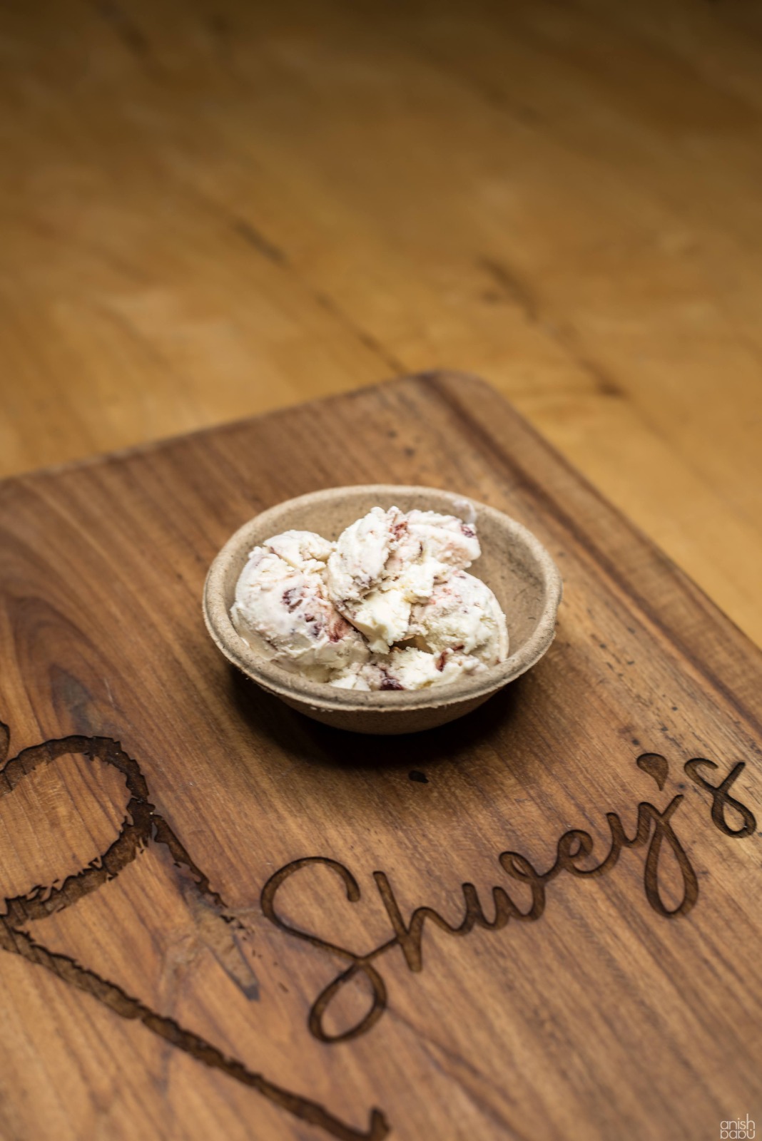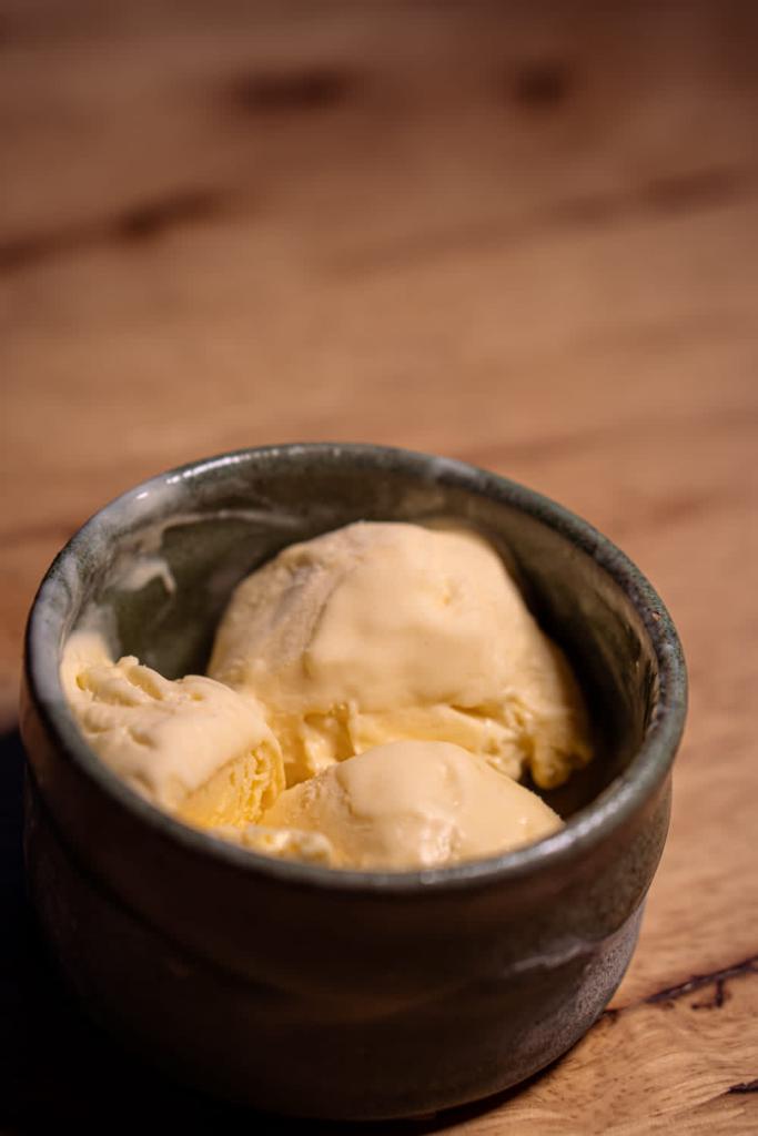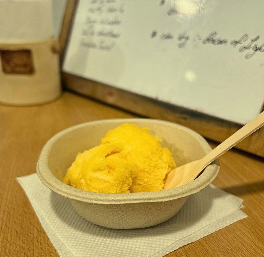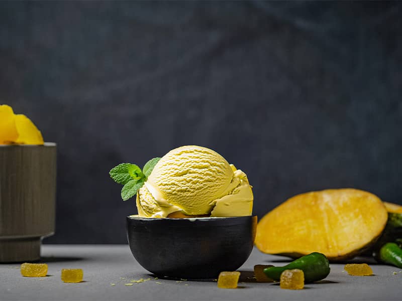 Sweet Alphonso mango ice cream with fiery bits of jalapeno