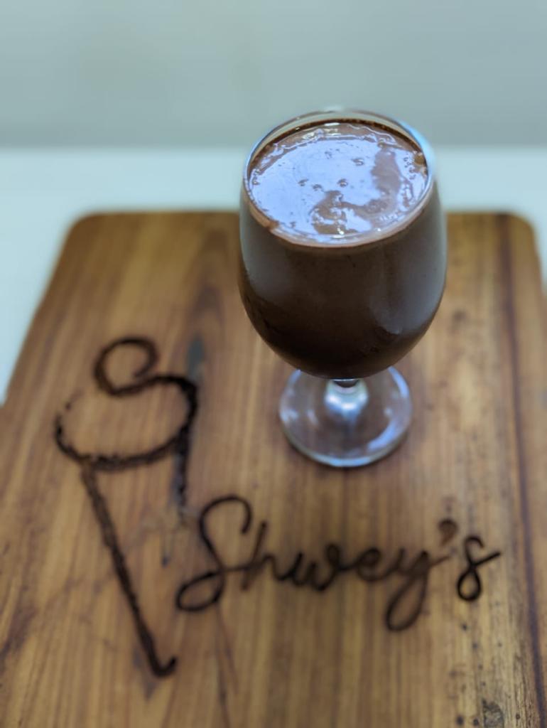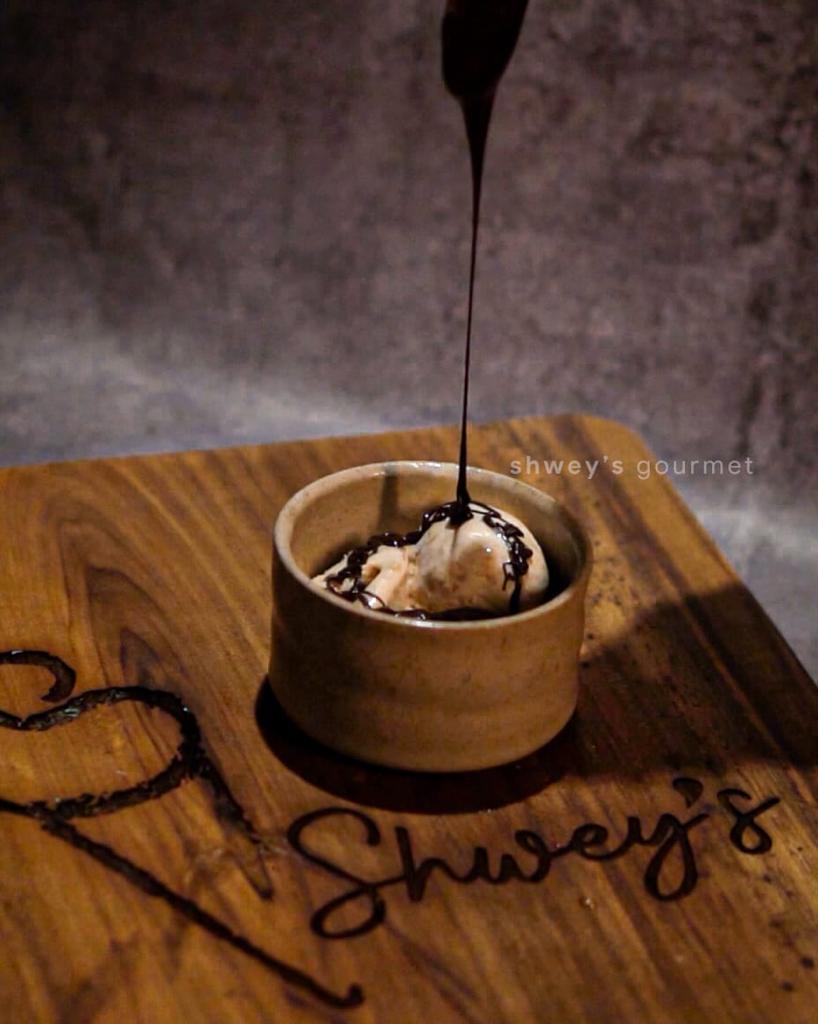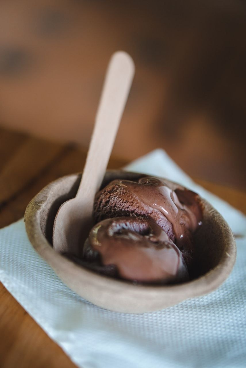 Peanut butter ice cream topped with hot chocolate fudge sauce