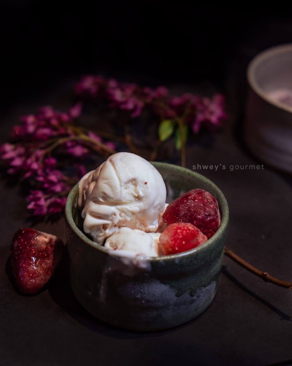 Generous helpings of homemade strawberry compote in our signature cream ice cream